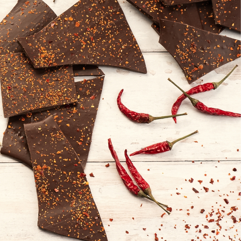 A dark and spicy chocolate. A chocolate bar made of exclusive raw materials and sprinkled with chiliflakes – a heavenly combination, loved already long ago by the Aztecs.