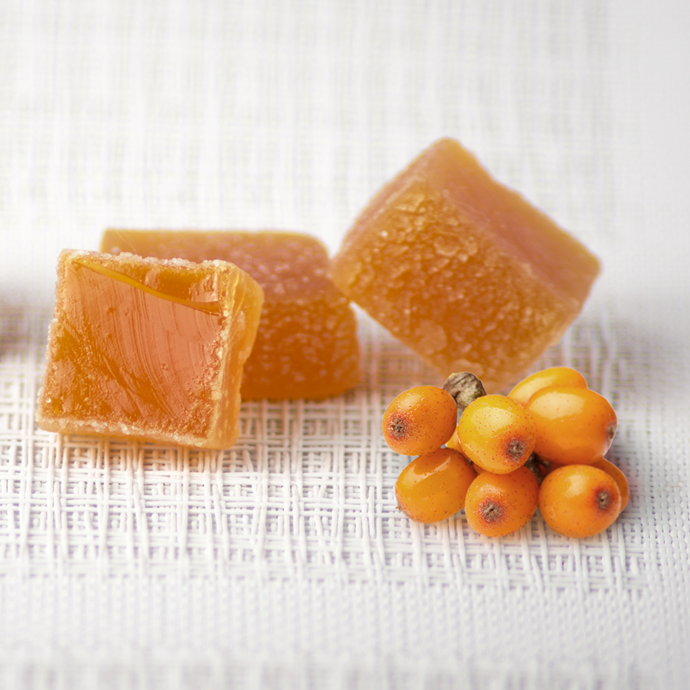 Authentic buckthorn berries give these soft sea-buckthorn jelly sweets its orange colour, its aroma and its flavor. Try the buckthorn jelly sweets together with cheese – delicious! Contains 20% juice from buckthorn berries.