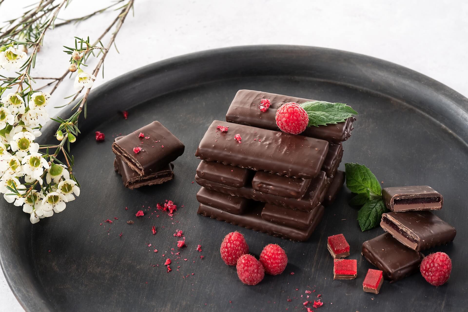 Crisp chocolate on the outside, a delicious raspberry marmalade inside. Together with soft and velvety truffle this is a fruity and elegant chocolate bar which makes you feel good.