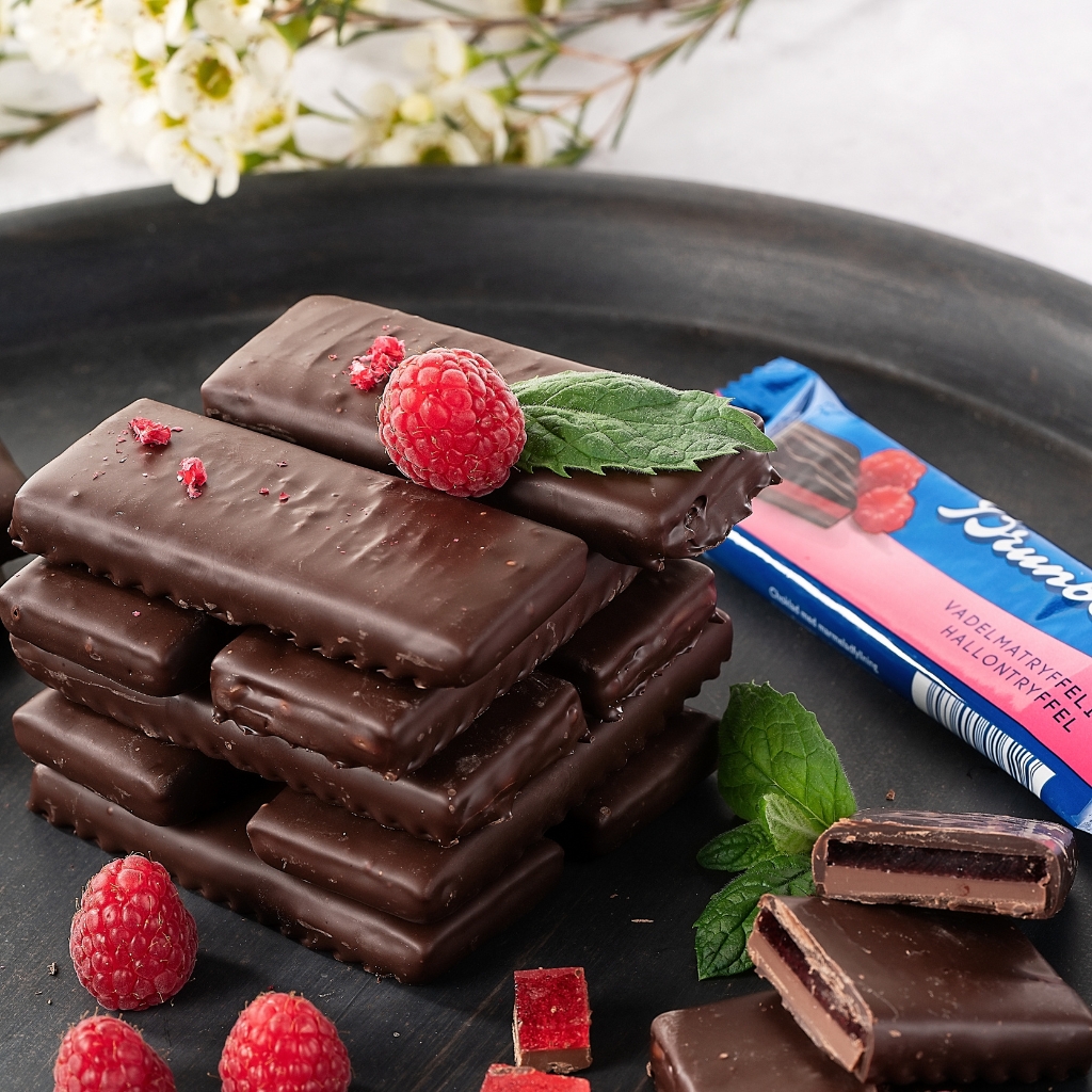 Crisp chocolate on the outside, a delicious raspberry marmalade inside. Together with soft and velvety truffle the raspberry truffle bar is a fruity and elegant chocolate bar which makes you feel good.