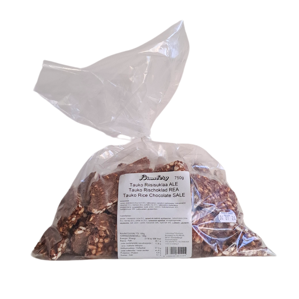 Lactose and gluten free Tauko rice chocolate with a real lactose free milk chocolate coating is now also available in a big second-rate bulk bag! This bag contains rice chocolate pieces that differ from the standard in shape or size.