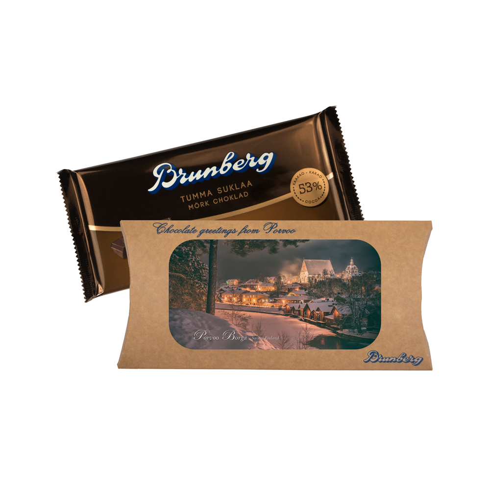 A bar of deliciously full-bodied dark chocolate hidden in a beautiful Porvoo-themed gift cover. The gift chocolate bar is easy to send by mail!