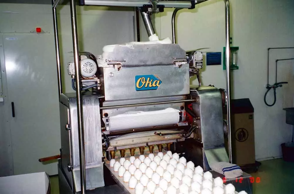 Oikea vastaus on, että ilman täytettä ohuen ohut suklaakuorrute ei pysyisi muodossaan. Eli ensin asetellaan liukuhihnalle rivi vohveleita, joille pursotetaan täyte tasaisesti. Matka jatkuu kohti kahta suklaaputousta, joissa koko paketin päälle valutetaan ohut kerros sulaa suklaata.