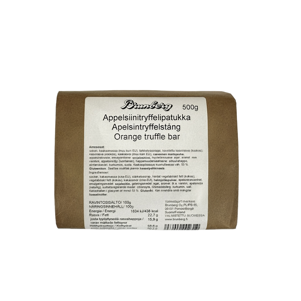 Päällä lohkeilevaa suklaata, sisällä miellyttävän maukas appelsiinimarmeladisydän. Pehmeyttä tuo suussa sulava tryffeli. Appelsiinitryffelipatukka on hedelmäisen raikas, hyvän tuulen suklaapatukka.