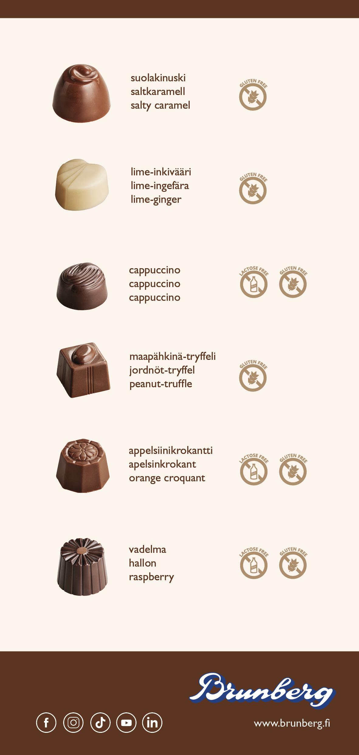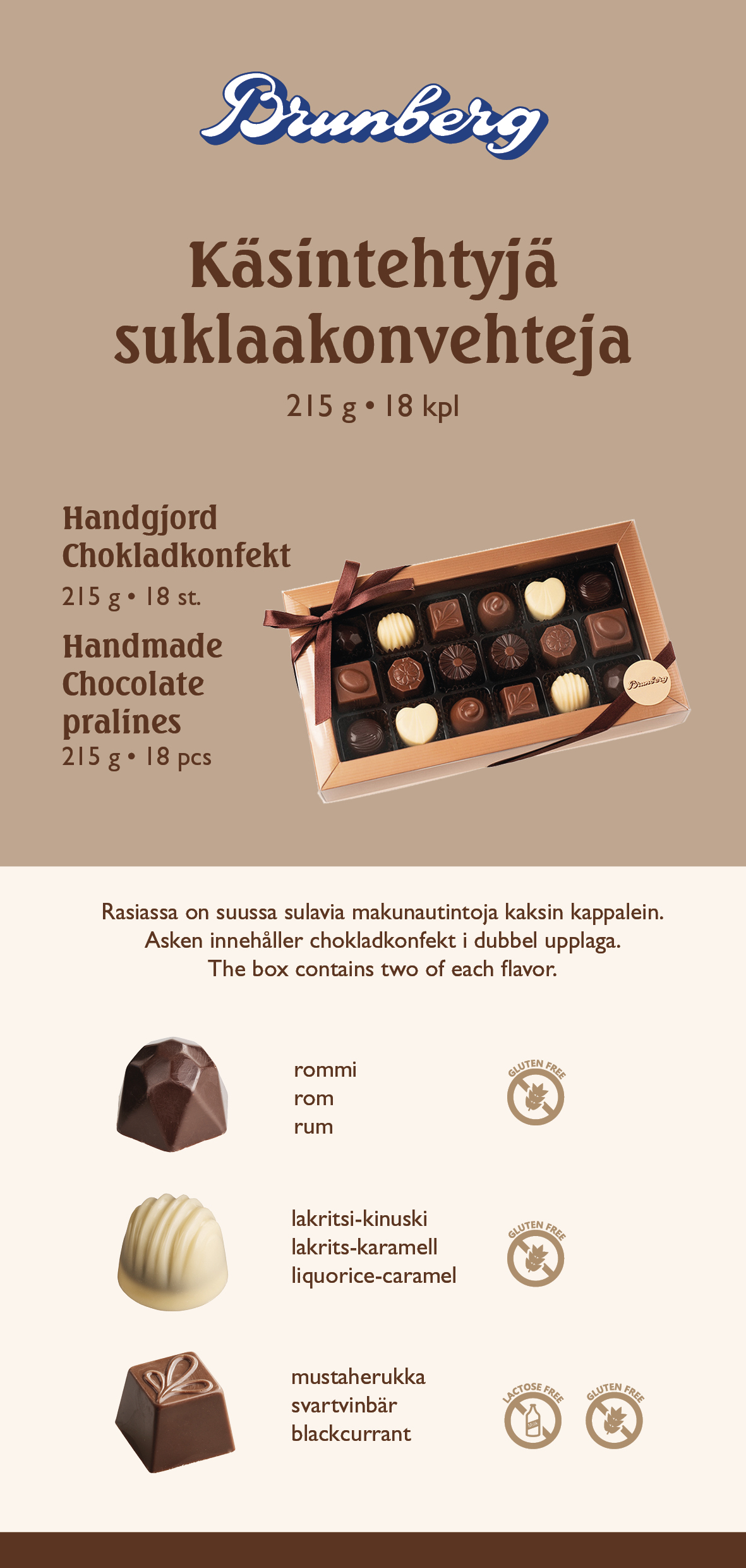 Brunbergin ylellisiä käsintehtyjä suklaakonvehteja annetaan lahjaksi ja nautitaan omissa hemmotteluhetkissä. Elämä on kuin konvehtirasia – täynnä makeita yllätyksiä ja parhaimmillaan jaettuna läheisten kanssa.