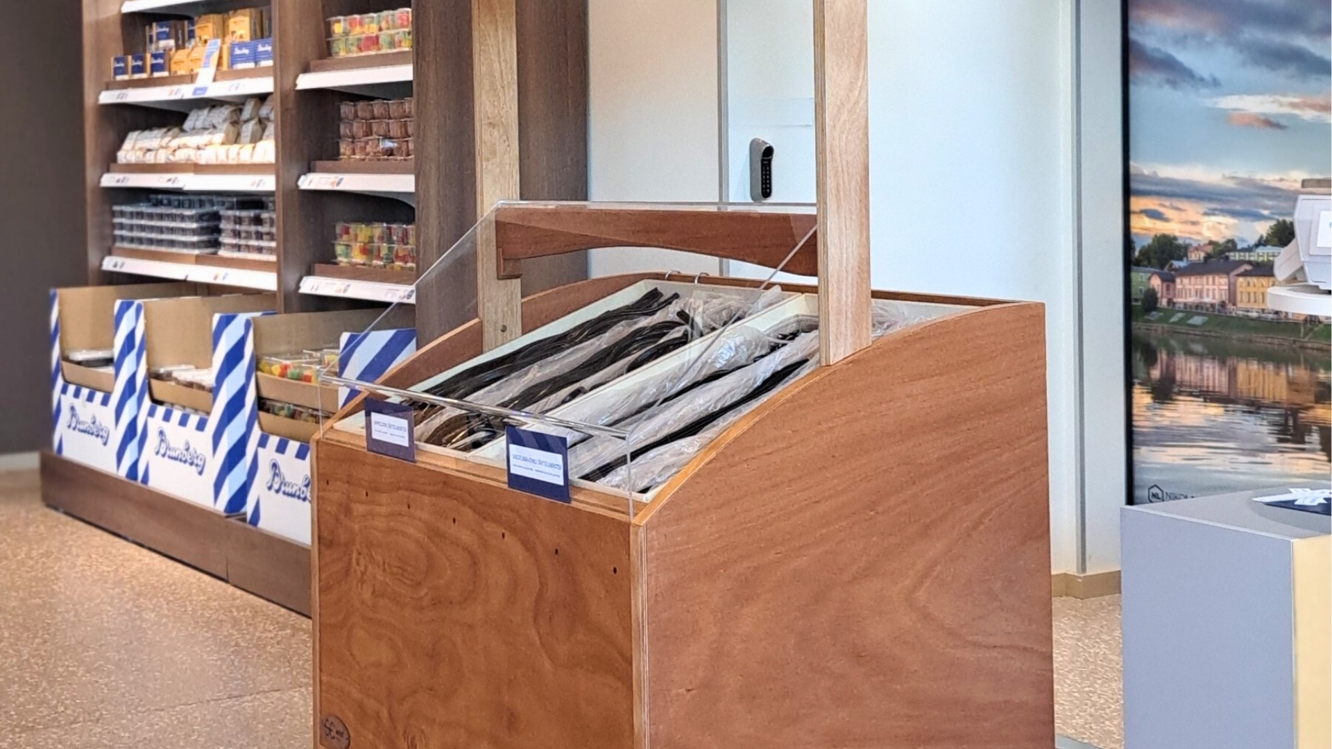 Lakritsivaunun on suunnitellut ja valmistanut paikallinen SEwood Finland, joka on erilaisten pienesineiden valmistukseen erikoistunut puutyöverstas Porvoossa. Vaunu on valmistettu ja pinnoitettu mahonkivanerilla ja pintakäsitelty elintarvikehyväksytyllä Rustins Danish Oil -puuöljyllä. Pyörien ansiosta lakritsivaunu on helposti siirrettävissä myymälän sisällä. Myyntikoju täydentää hienosti tehtaanmyymälän avaraa tilaa.